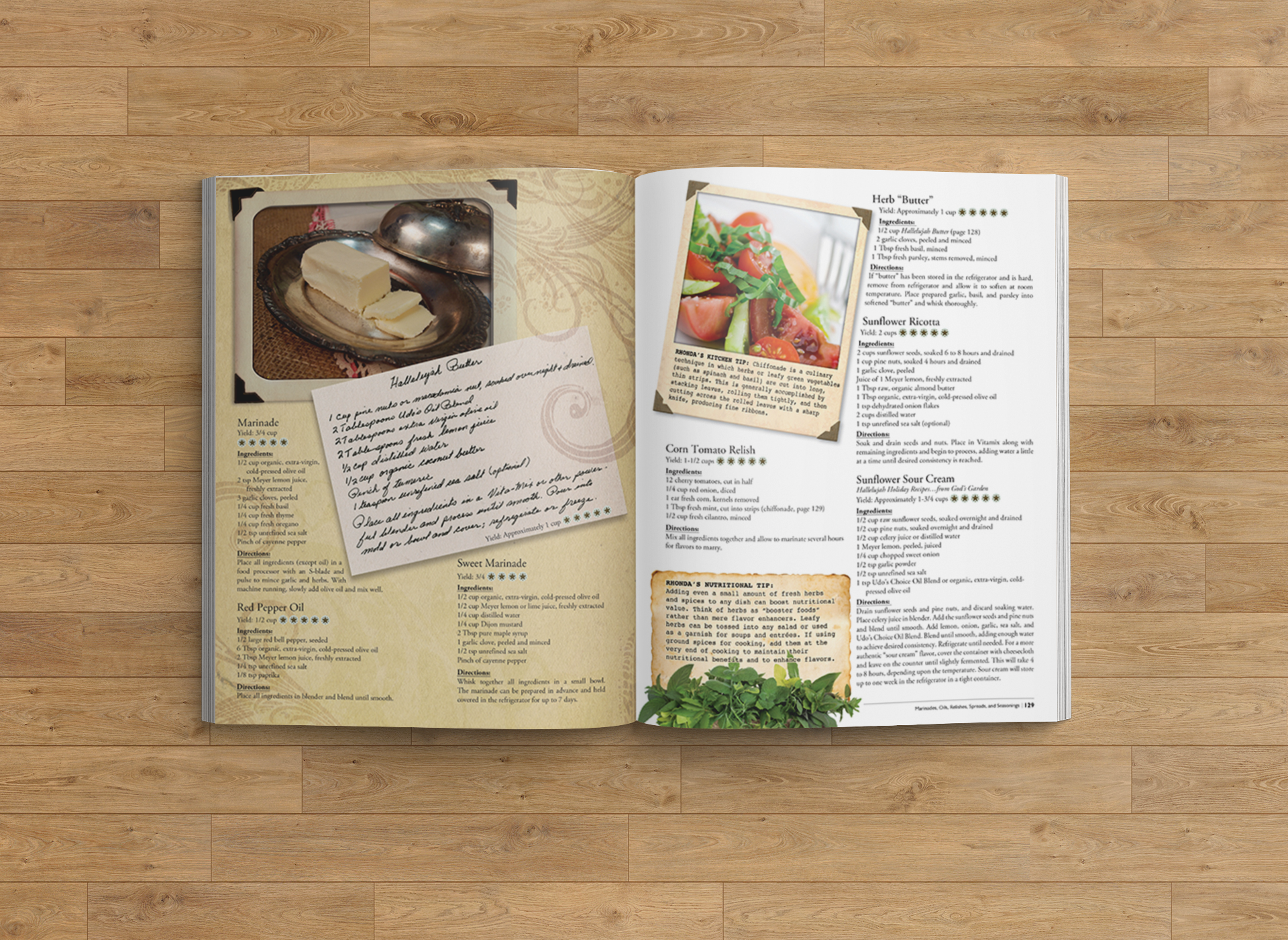 This is a vegan cookbook I designed for the co-founder of Hallelujah Acres. I photographed the cover image as well as several recipes inside.